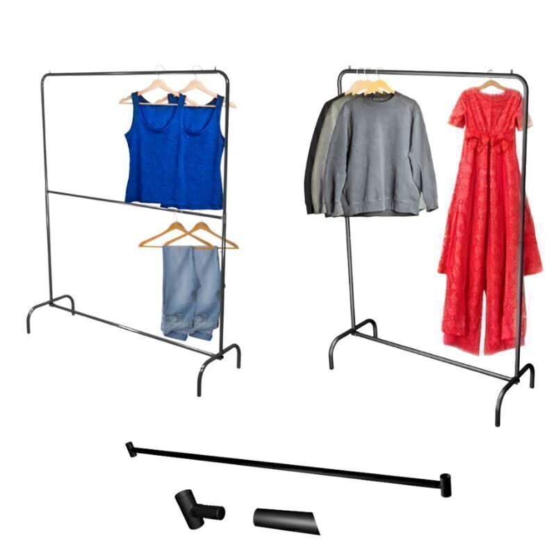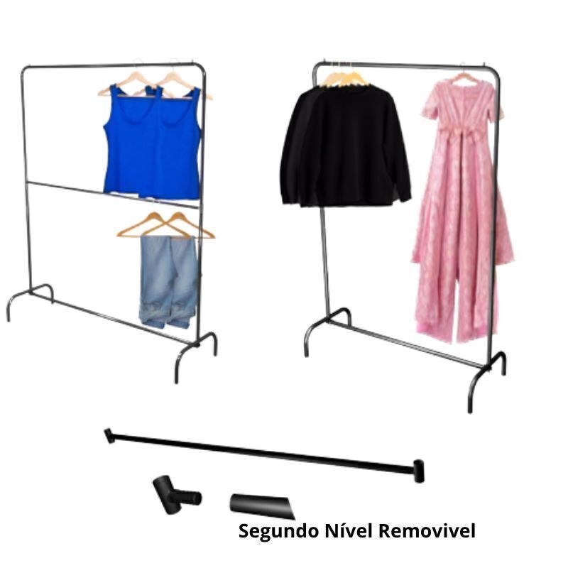 Ideal para lojas, eventos ou até mesmo em casa, a arara se adapta facilmente a diferentes espaços. Com o segundo nível, a capacidade de roupas expostas é maximizada. O suporte adicional é perfeito para pendurar, ajudando na organização e no aproveitamento do espaço. Exiba desde camisetas até vestidos com toda a praticidade que você merece.
