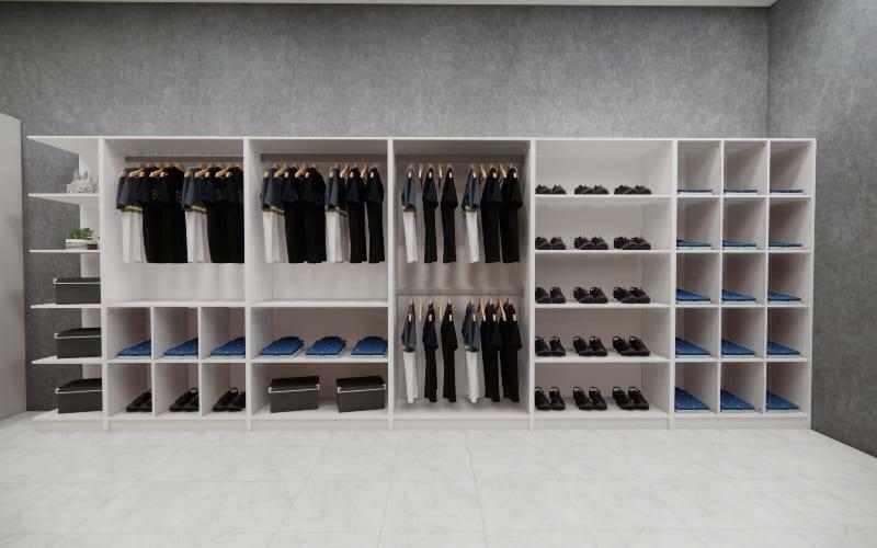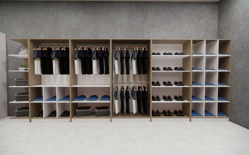 Unir exposição e armazenamento em um único móvel modular, proporcionando organização prática e visual para roupas, acessórios e materiais diversos.