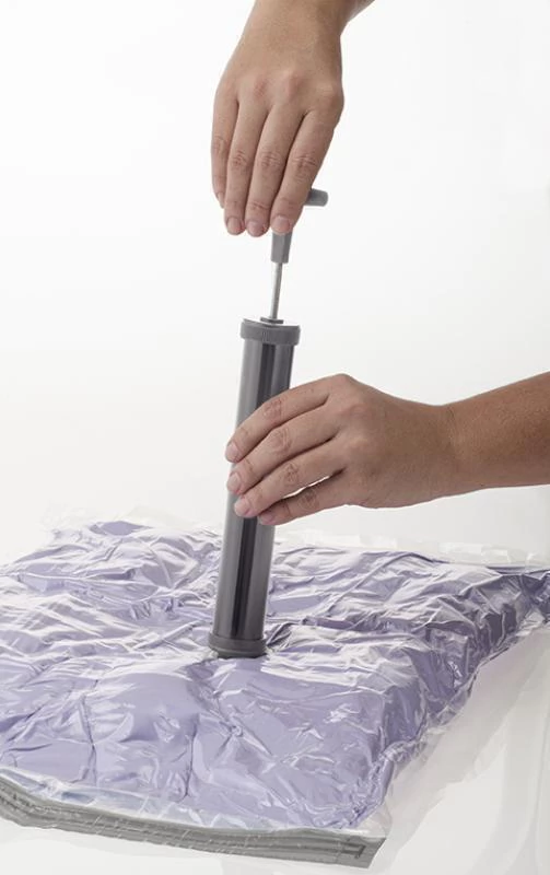 Remover o ar dos sacos a vácuo da linha Compact, ideais para armazenar alimentos, roupas, edredons e cobertas, proporcionando maior conservação, economia de espaço e proteção contra bactérias e umidade.