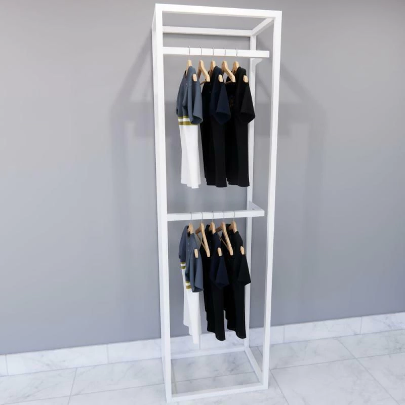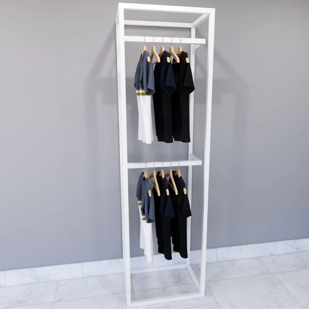 Com estrutura metálica robusta e duas araras com trilhos de cremalheira central, o sistema permite o ajuste de altura das prateleiras e hastes, adaptando-se facilmente a diferentes tipos e tamanhos de produtos. Seja para organizar peças longas, dobradas ou acessórios, este conjunto oferece total flexibilidade na montagem.