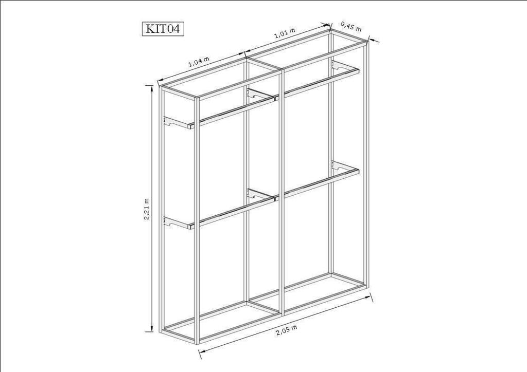 Acompanha quatro araras fixas com tubo oblongo de 1,00 metro, que podem ser posicionadas conforme a necessidade do seu espaço. A estrutura é composta por uma peça inicial e uma peça de continuação, permitindo expansão modular conforme seu projeto.